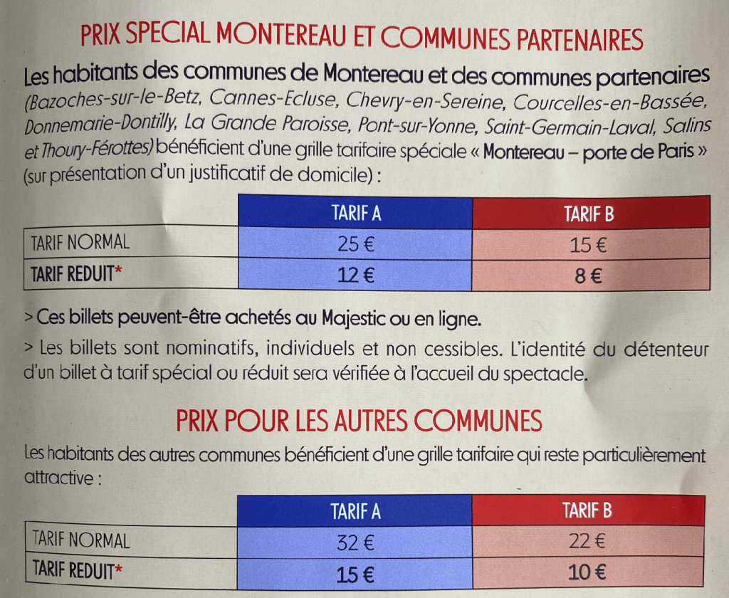 A cette occasion, a été distribué dans nos boîtes aux lettres un prospectus dans lequel sont mentionnés les tarifs permettant d’assister aux futurs spectacles.