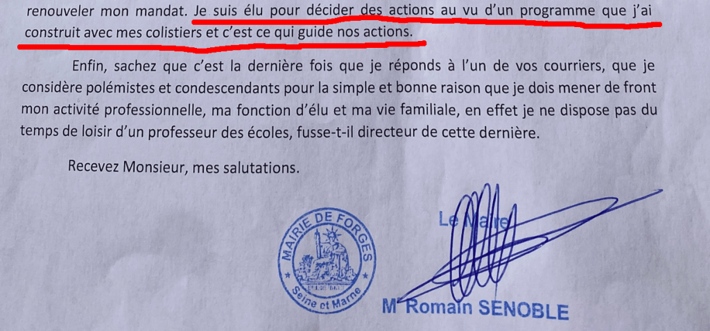 Mon maire qui au passage (il aime souvent rappeler qu’il n’est que de passage, si si…), mon maire qui ne me répond plus lorsque je le salue fort poliment, y compris dans le bureau de vote forgeois.