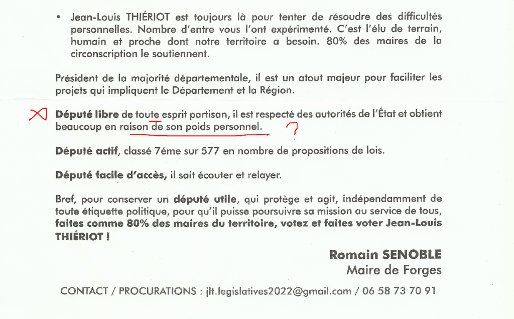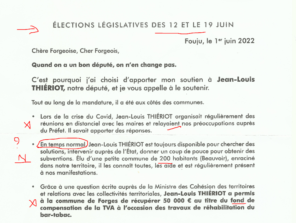 Vous l’aurez compris, les ajouts en rouge sont dus à votre serviteur : j’ai décidé pour les prochaines élections d’aider mon édile à moi à mieux maîtriser syntaxe et orthographe.